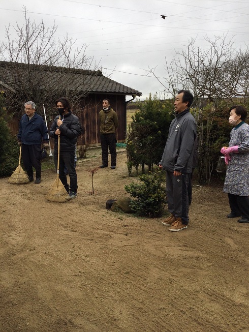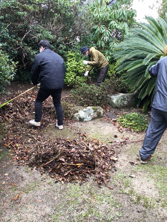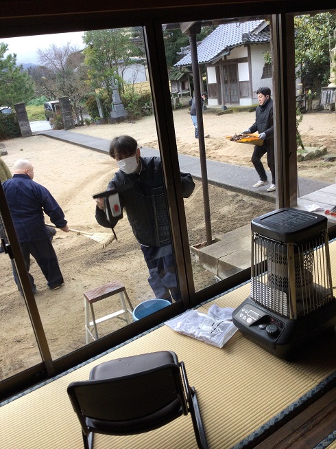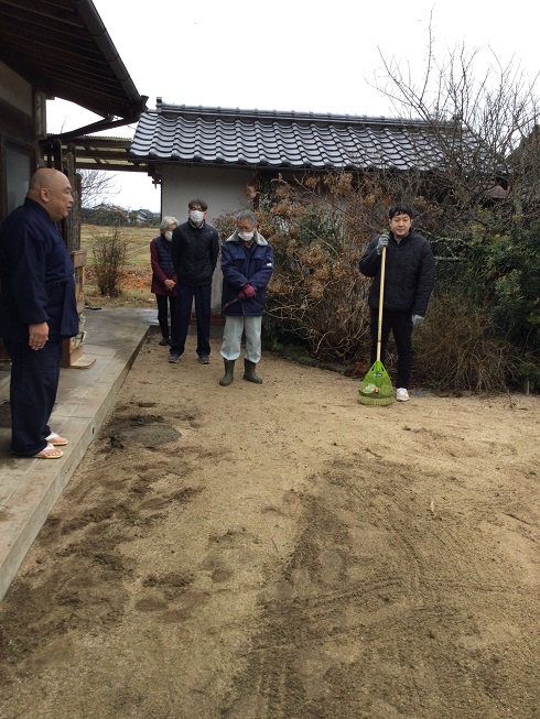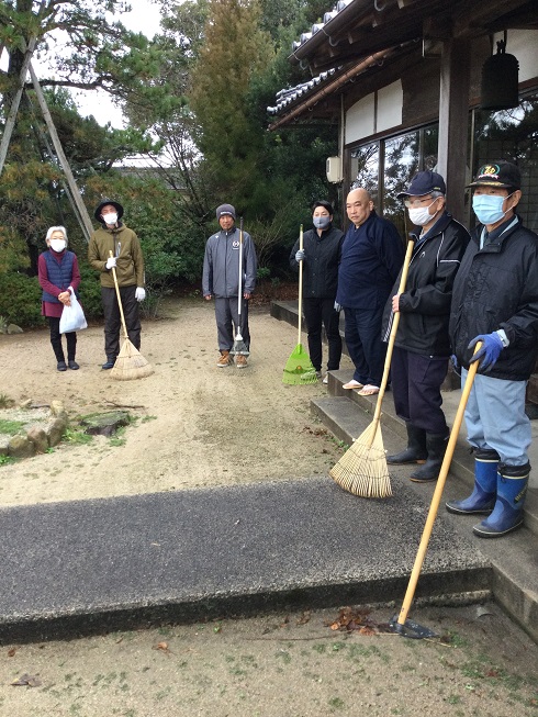 檀家が集中している西代を町内会単位に5地区に分け(西代以外の檀家は適宜)、ローテーションで奇数月に実施しようというもの。すでに2022年(令和4年)11月にスタートしています。新年最初となる1月の担当は上組東。近隣の国富地区の檀家も加わり、合わせて13名が15日(日)午前9時から1時間境内の除草や窓拭きなどをしました。 この日は早朝、雨模様でしたが作業が始まる頃には雨も上がり、正文住職は箒の目の入った庭を見やって感謝、感謝でした。